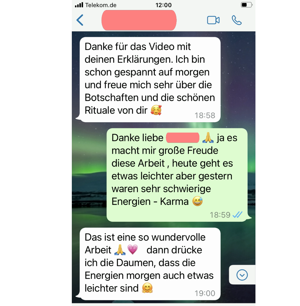 Ich biete regelmäßig themenspezifische Rituale zu kraftvollen Themen wie Reinigung, Vergebung, Heilung oder Stärkung an. Diese Rituale werden von mir angekündigt, und Sie können sich dafür anmelden. Sie finden in einer Gruppe statt, jedoch ohne das direkte Beisein der Teilnehmer. Die energetische Arbeit wird von mir durchgeführt und entfaltet ihre Wirkung individuell bei jedem Einzelnen.